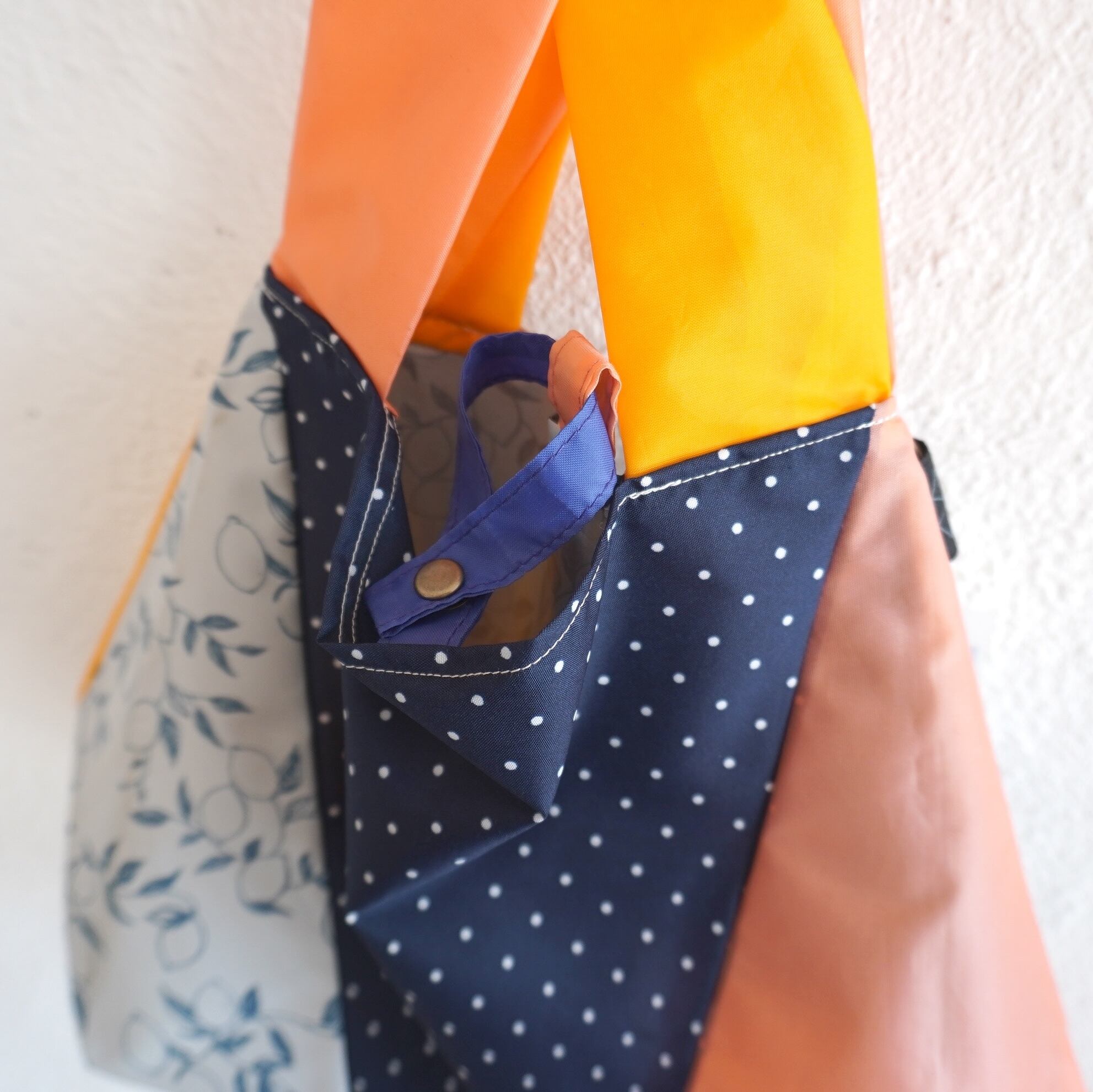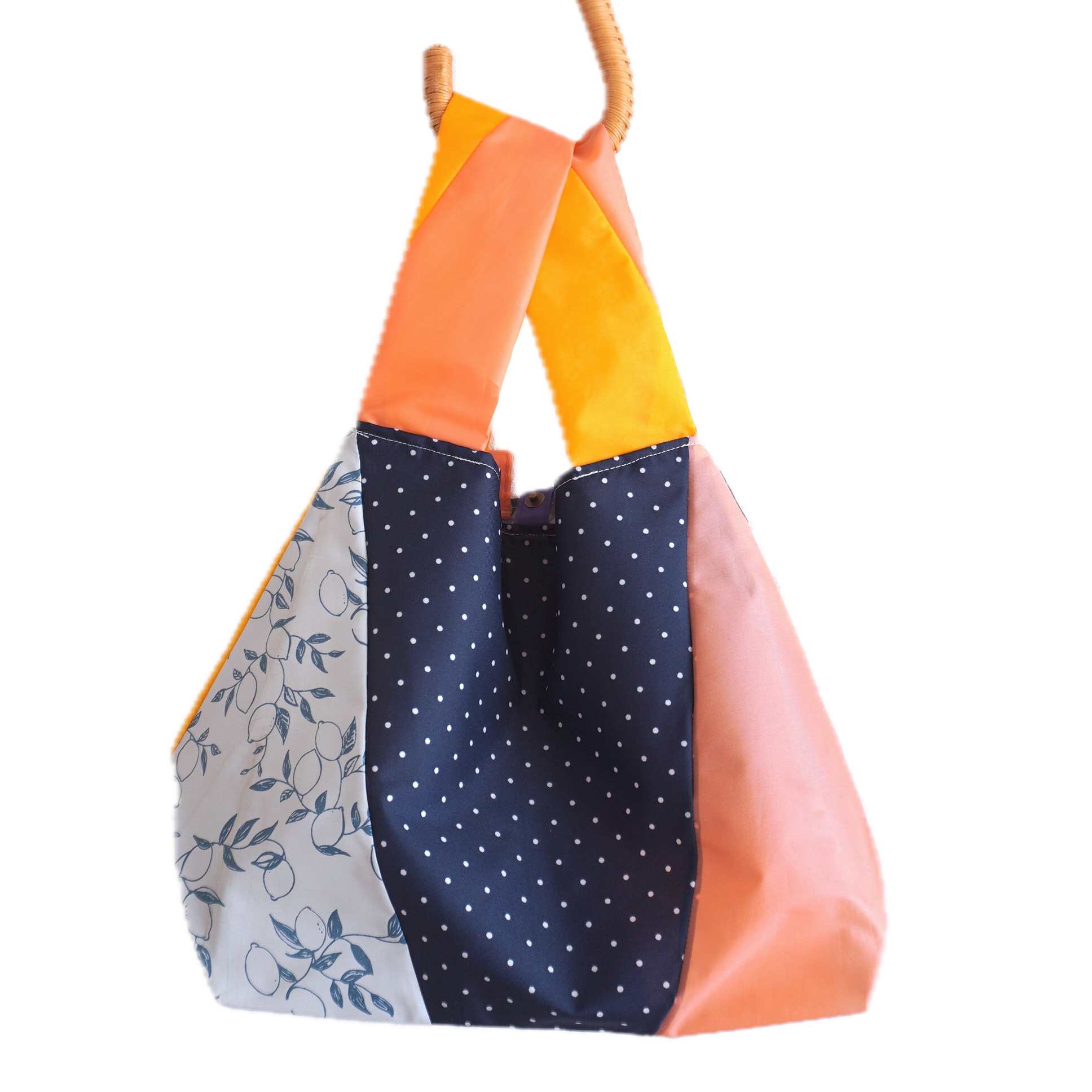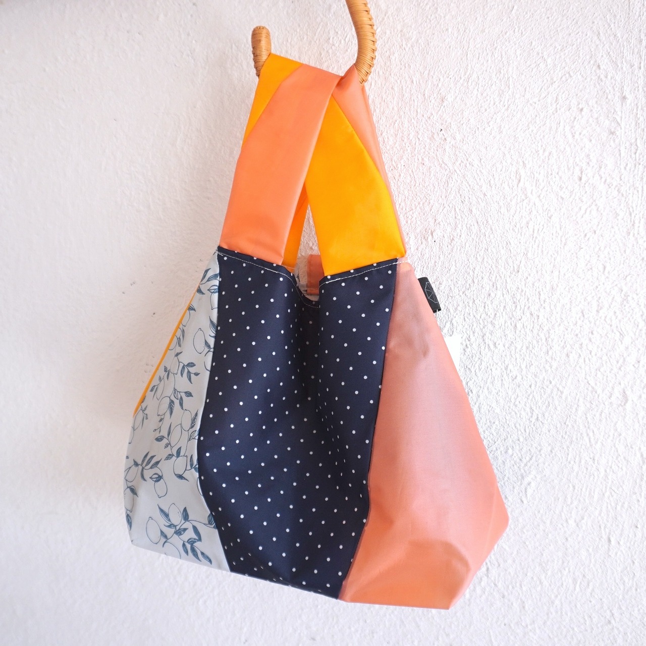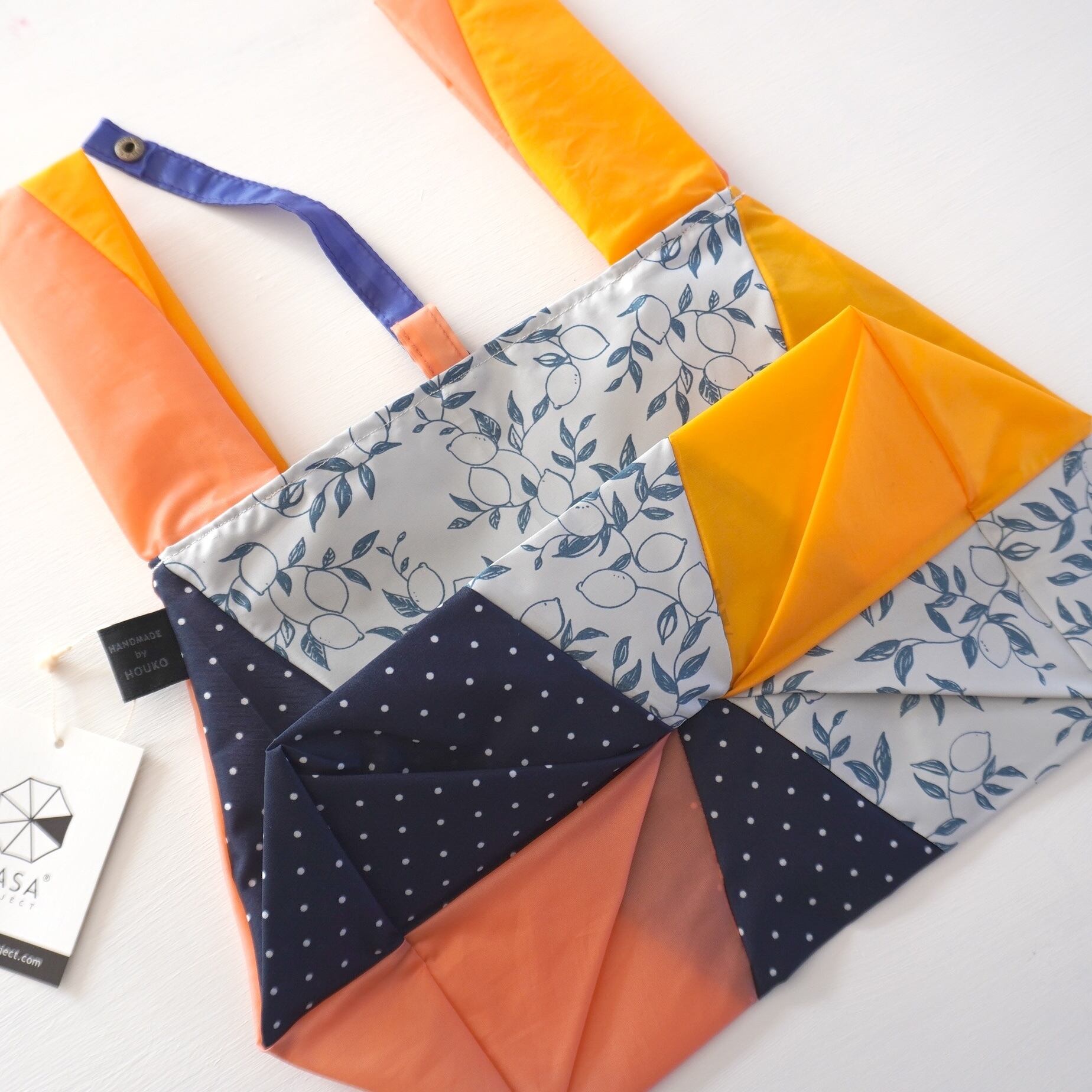 不用になった傘の布をつなぎ合わせたショッピングバッグ(Mサイズ)です。