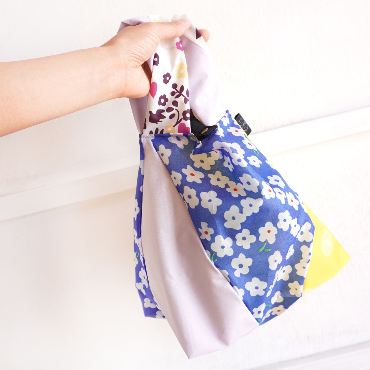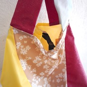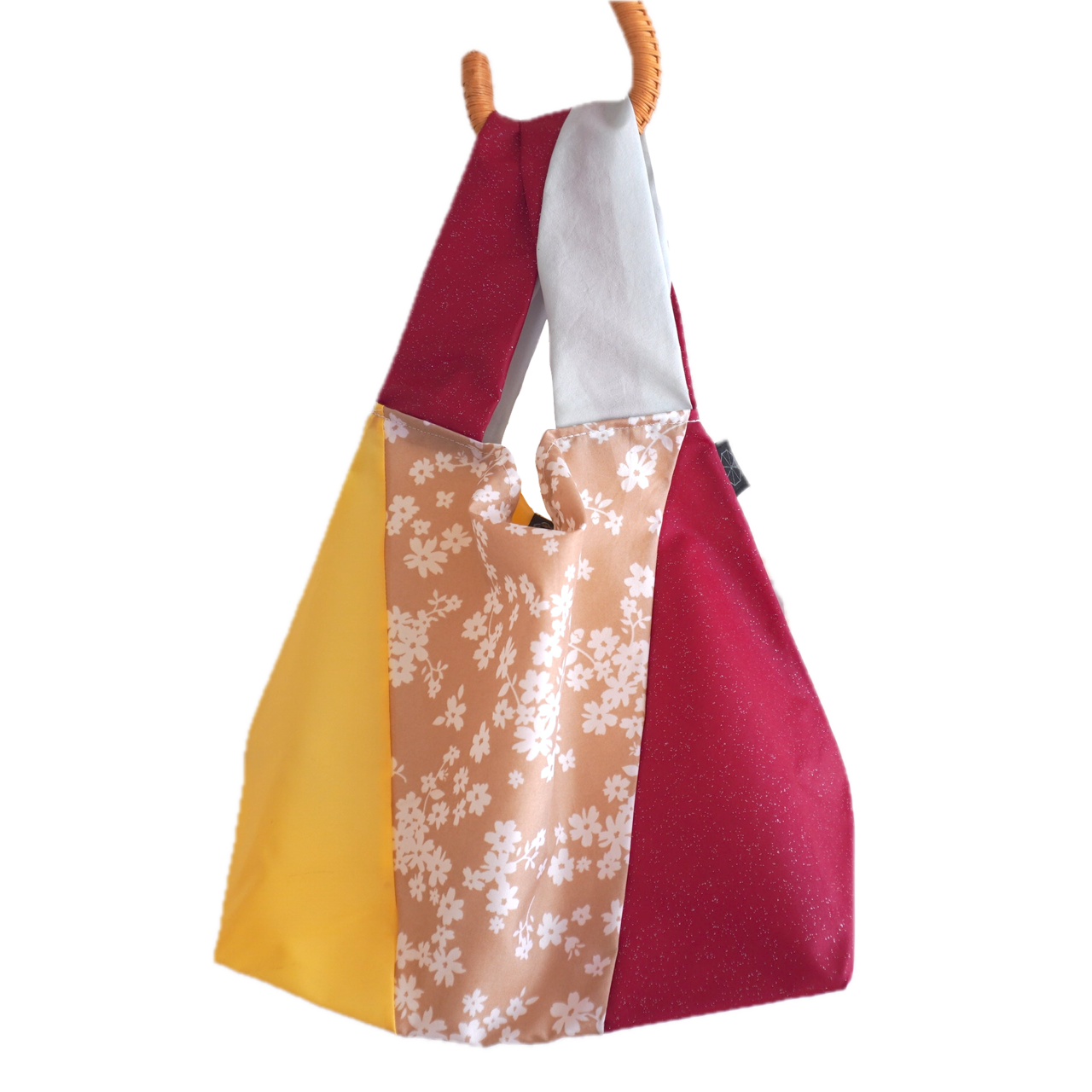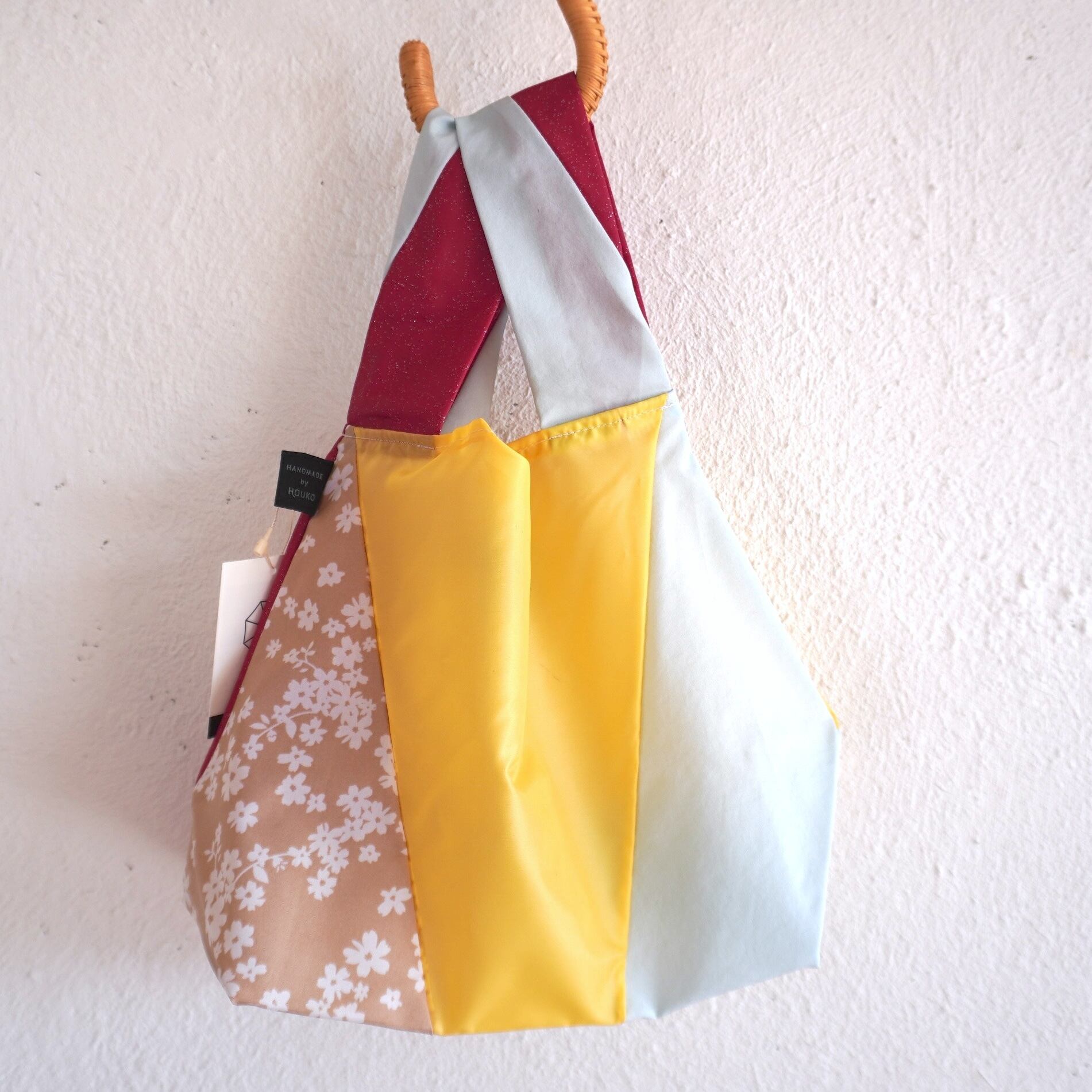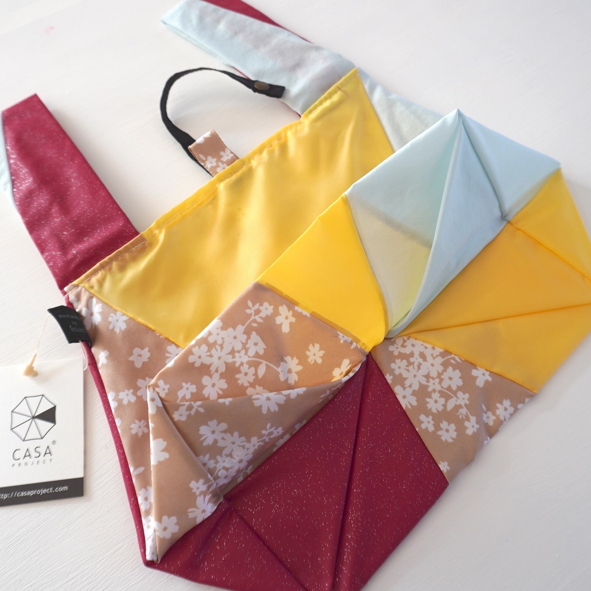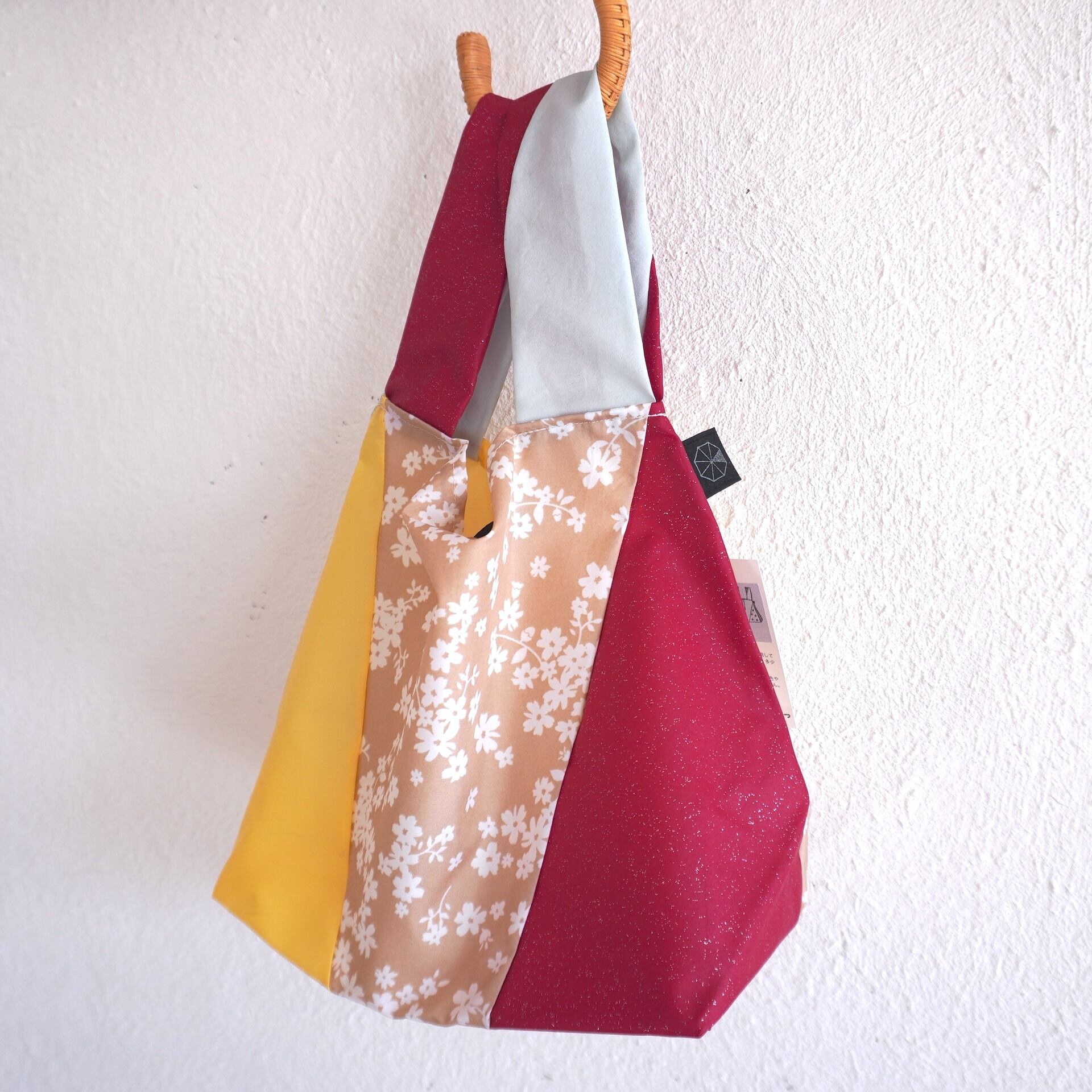 不用になった傘の布をつなぎ合わせたショッピングバッグ(Mサイズ)です。