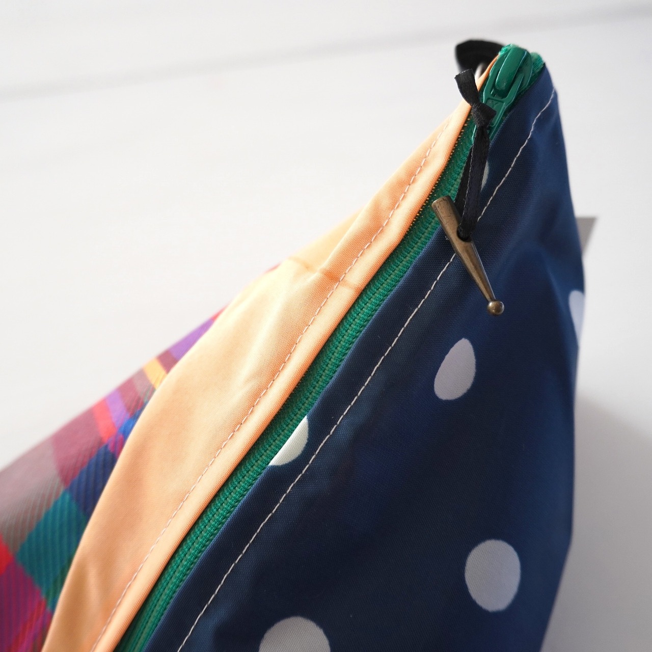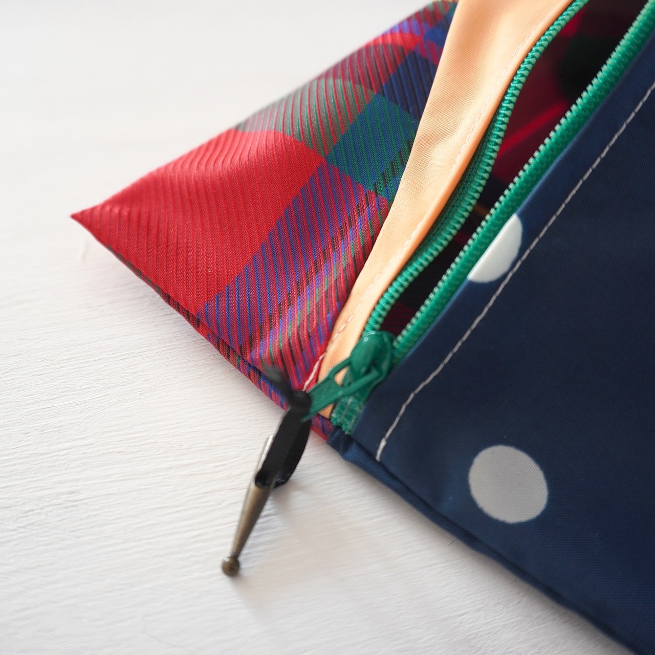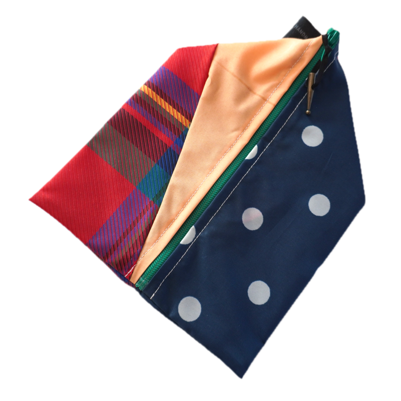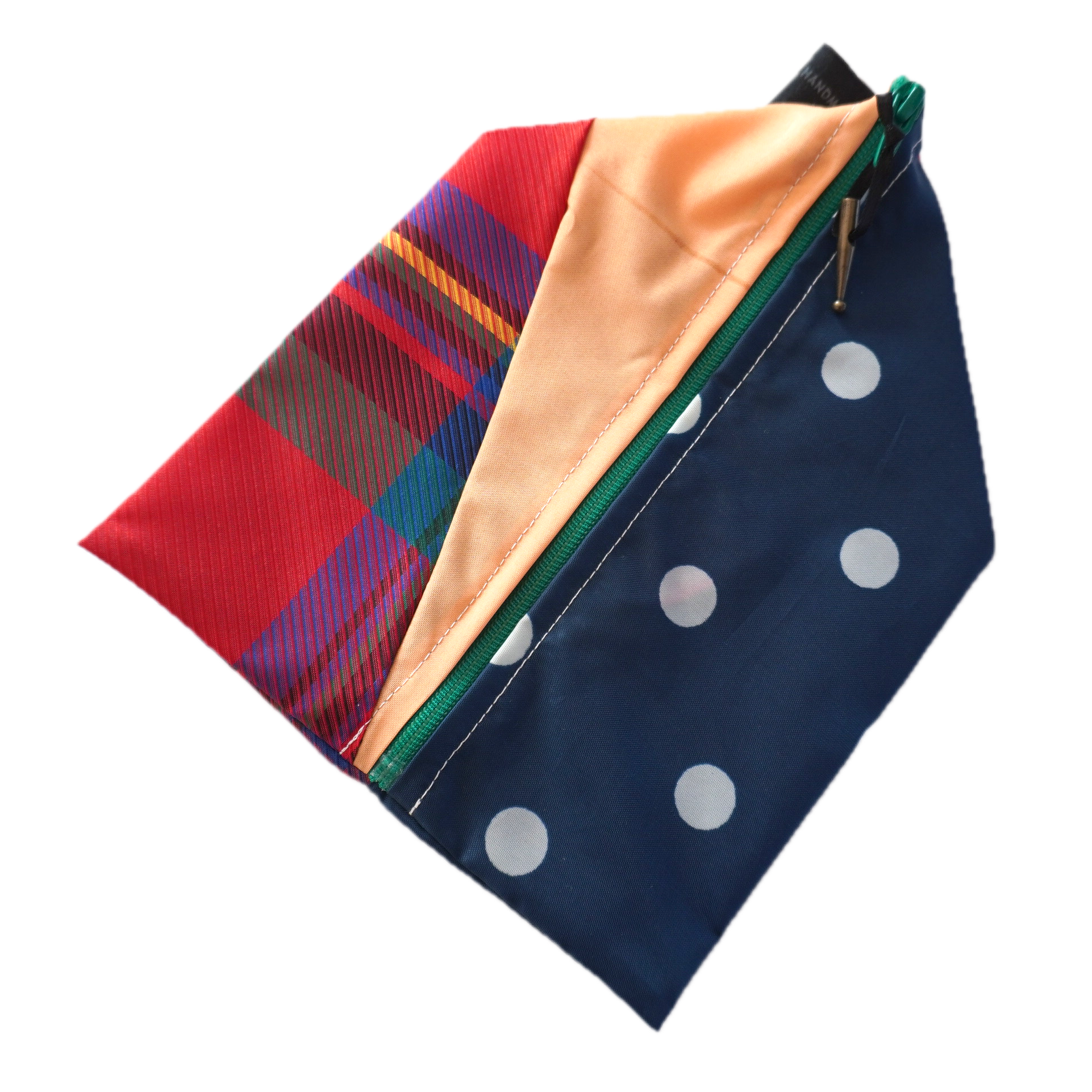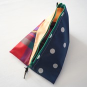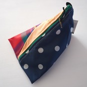 不用になった傘の布をつなぎ合わせたテトラ型のポーチです。