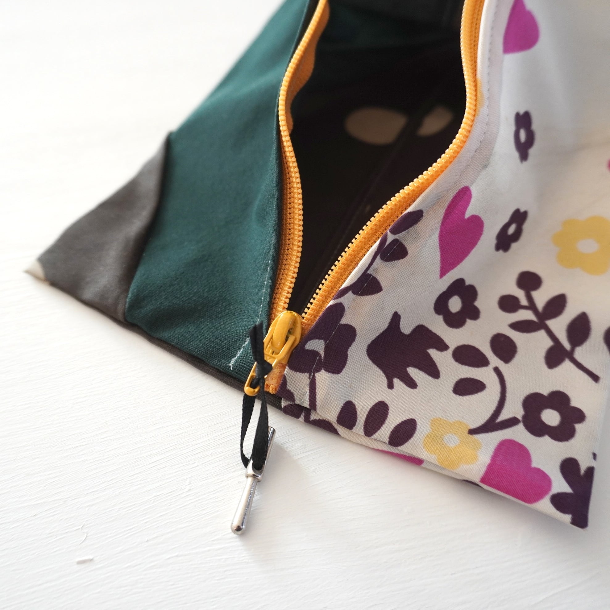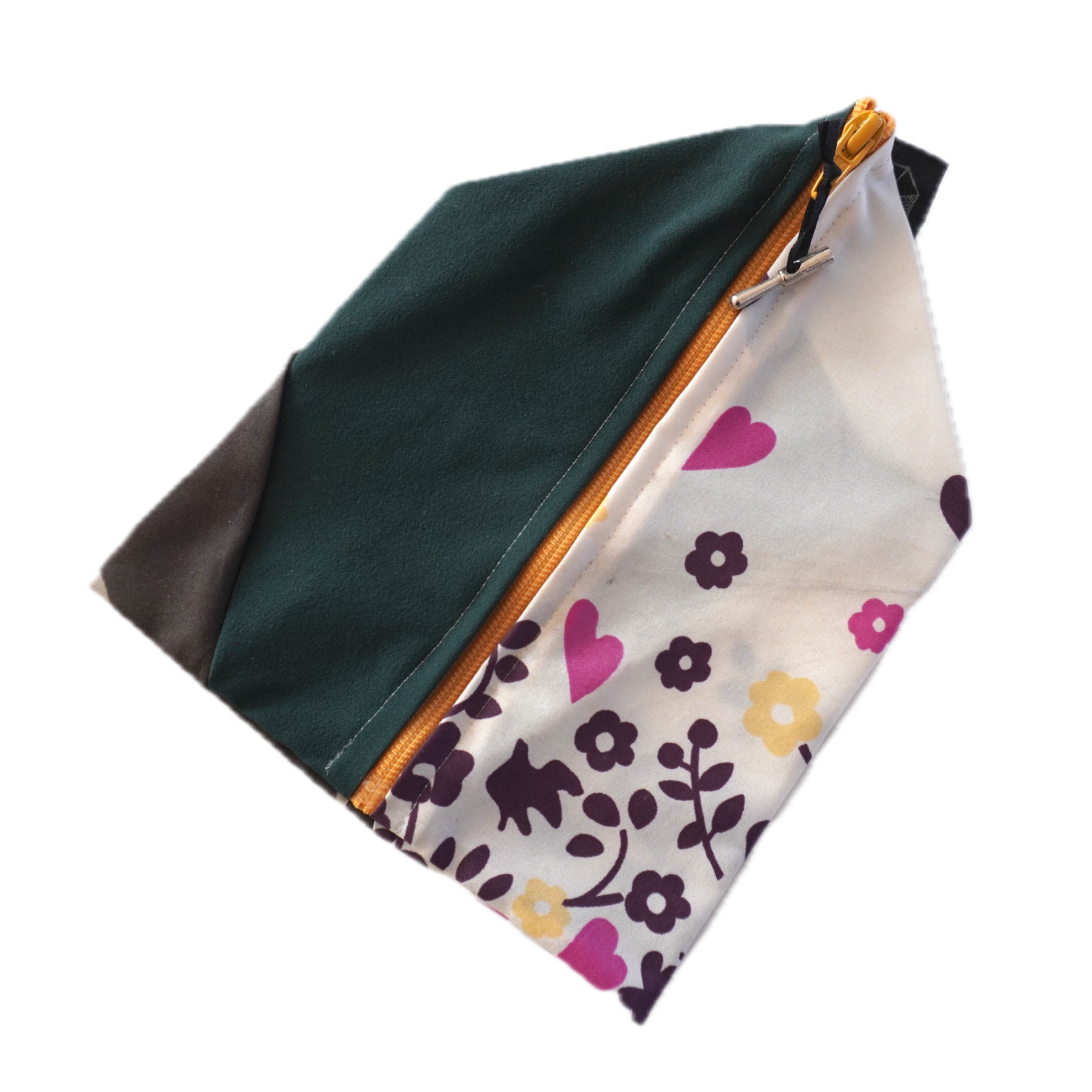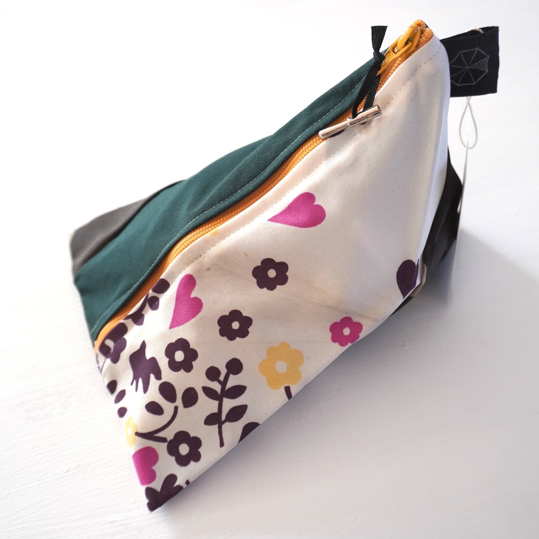 不用になった傘の布をつなぎ合わせたテトラ型のポーチです。