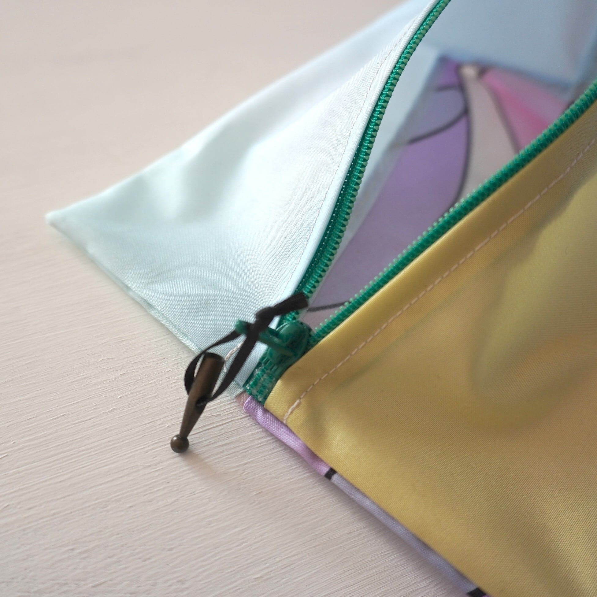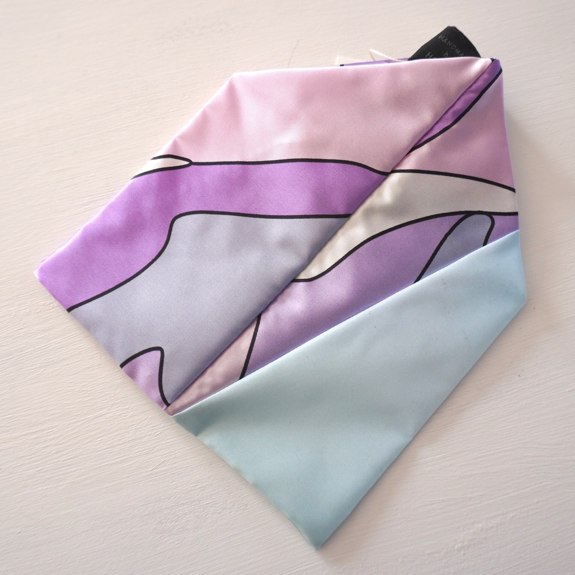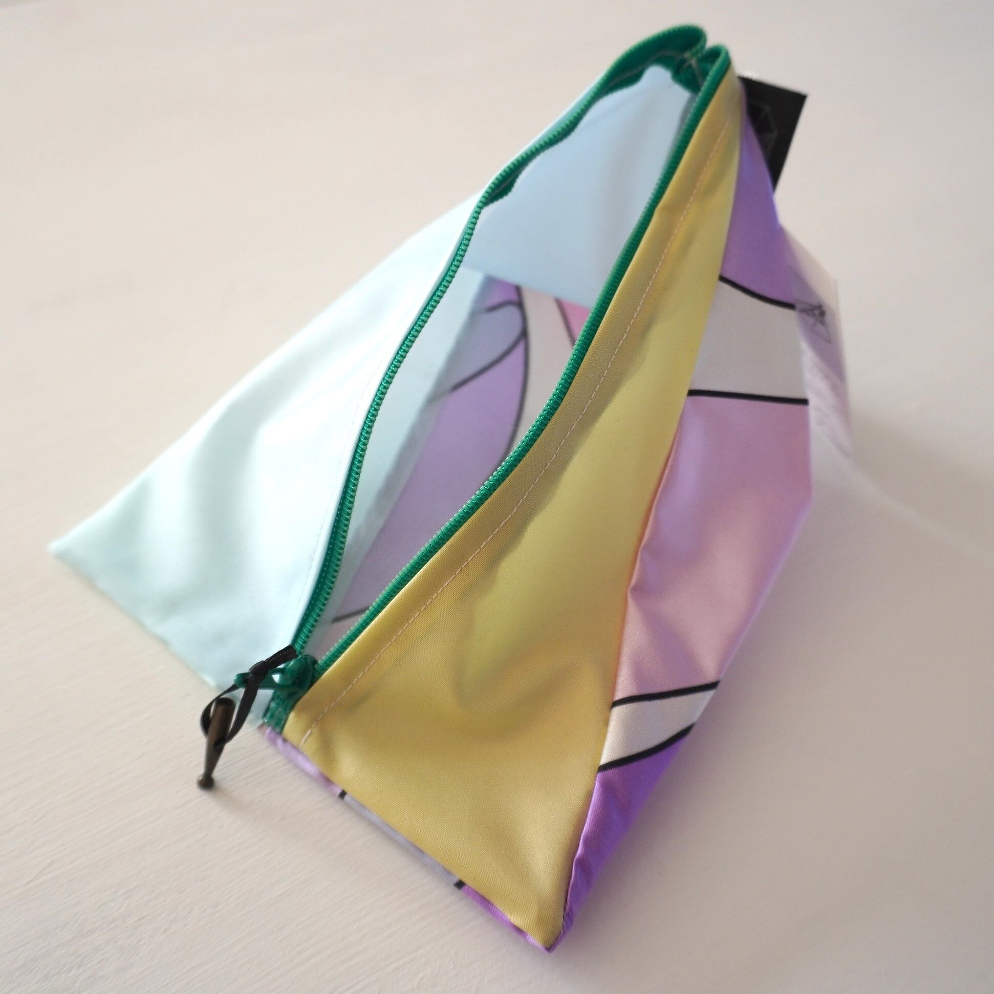 不用になった傘の布をつなぎ合わせたテトラ型のポーチです。