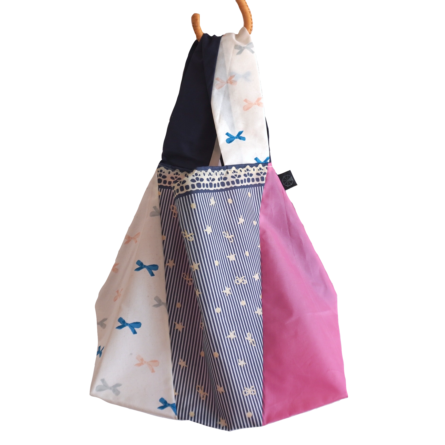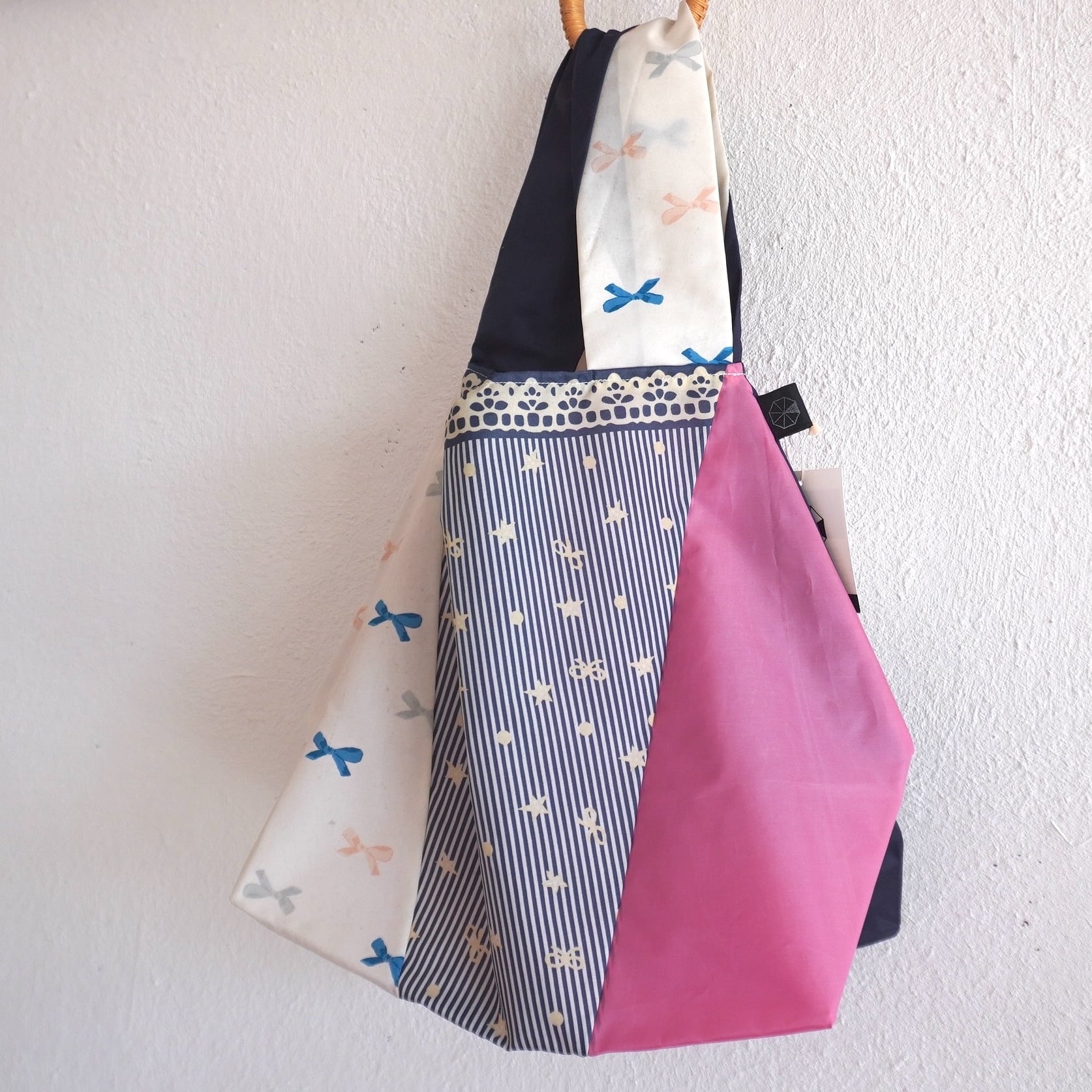 不用になった傘の布をつなぎ合わせたショッピングバッグ(Lサイズ)です。